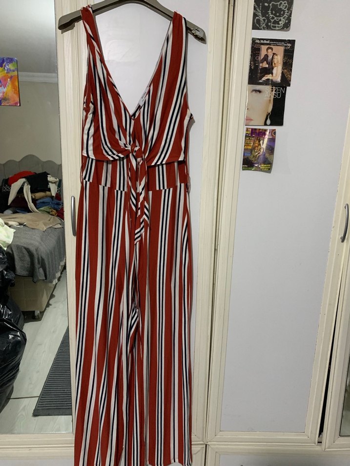 Kırmızı tonlarında çizgili, kolsuz ve V yakalı uzun kadın tulumu. Rahat kesim ve kemer detayına sahip, yumuşak sentetik kumaftan üretilmiştir.