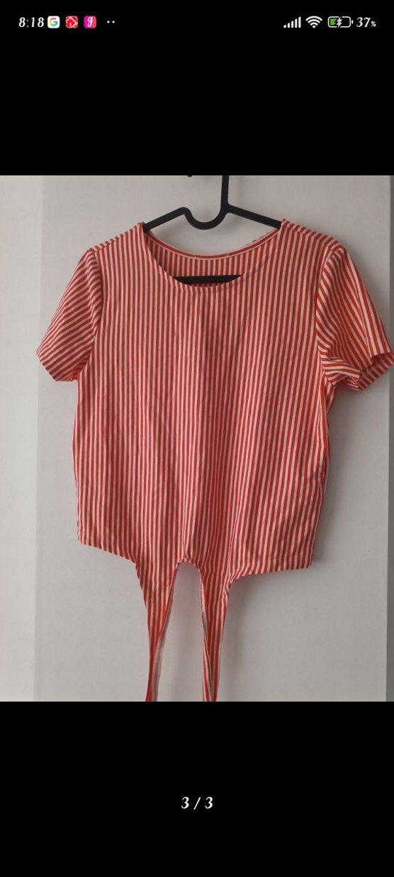 Kırmızı çizgili, kısa kollu ve yuvarlak yaka kadın tişörtü. Bol kesim, pilili detaylar ve midi boyda, sentetik kumaştan üretilmiştir. Günlük sokak stili için uygundur.