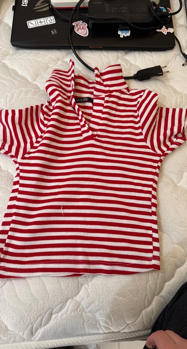 Kısa kollu, yakalı, triko dokuma kırmızı beyaz çizgili, kısa mini boy kadın bluz. Sentetik kumaştan, günlük sokak stiline uygun. ✨
