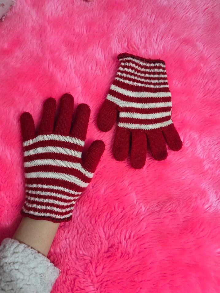 Renkli kırmızı çizgili, bohem ve retro tarzda kızlar için örgü eldivenler.