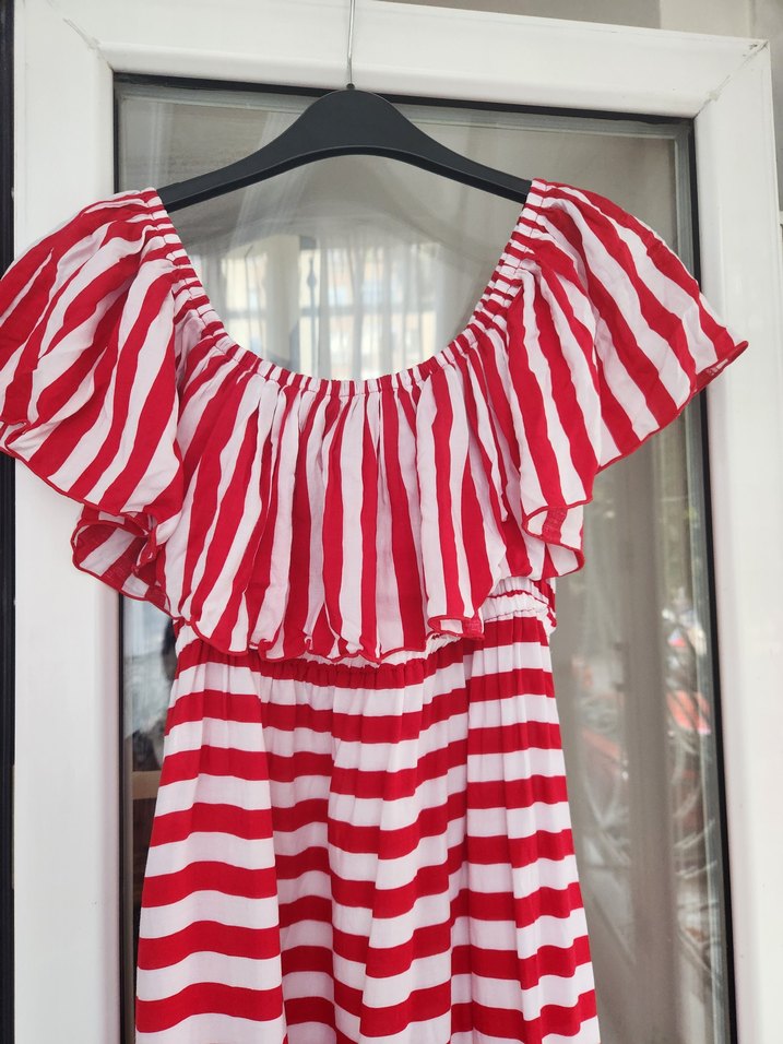 Kırmızı beyaz çizgili maxi boy elbise göğüs altından uzunluk 110 cm etek ucunda fıfırlı kısım var 38 beden
