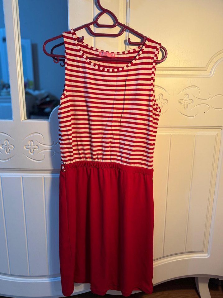 Kırmızı çizgili üst kısmı ve düz kırmızı piliseli etek kısmıyla, kolsuz ve fit kesimli midi elbise. Bohem tarzıyla günlük kullanıma uygundur.