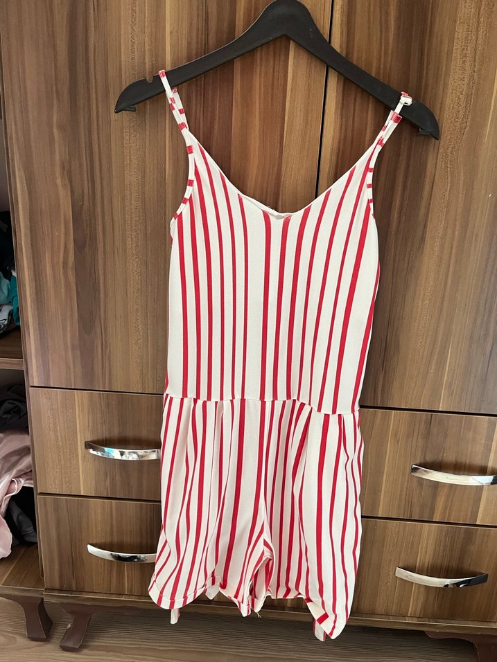 V yaka ve ince askılı, kırmızı dikey çizgili, sentetik kumaştan yapılmış, pilili ve kısa kesim, dar kesim kadın tulumu.