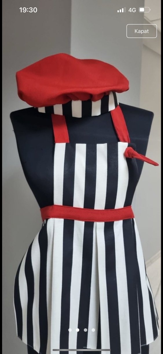 Bu mutfak önlüğü, siyah-beyaz dikey çizgiler ve kırmızı askılar ile bel bantı içerir, yanında uyumlu kırmızı şef şapkası vardır. Çocuklar için