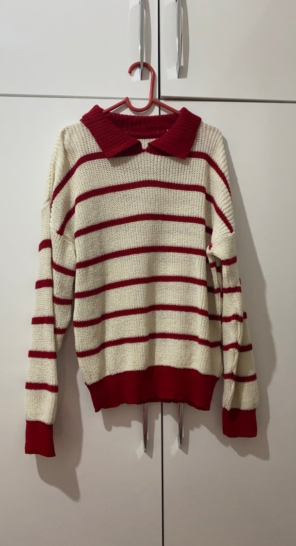 Uzun kollu, yakalı, kırmızı çizgili örgü kadın kazak, rahat ve salaş kesimle günlük sokak stiline uygun.