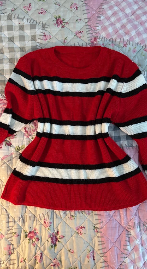 Renkli çizgili örgü kazak, uzun kollu ve yuvarlak yaka. Kırmızı, beyaz ve siyah çizgilerle bohem tarzda, günlük sokak giyimine uygun rahat kesim.