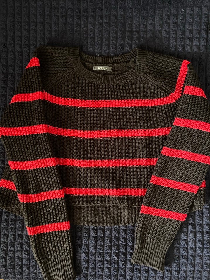 Yumuşak örgü kumaştan, uzun kollu ve bisiklet yaka, fitted kesim kadın kazak. Koyu kırmızı ve siyah çizgili, rahat ve şık günlük kullanıma uygun.