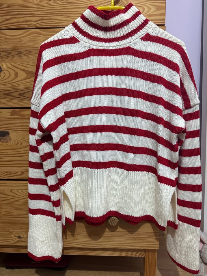 Kırmızı ve beyaz çizgili, uzun kollu ve balıkçı yaka örgü kazak. Rahat kesimi ve normal boyuyla günlük kullanıma uygundur.