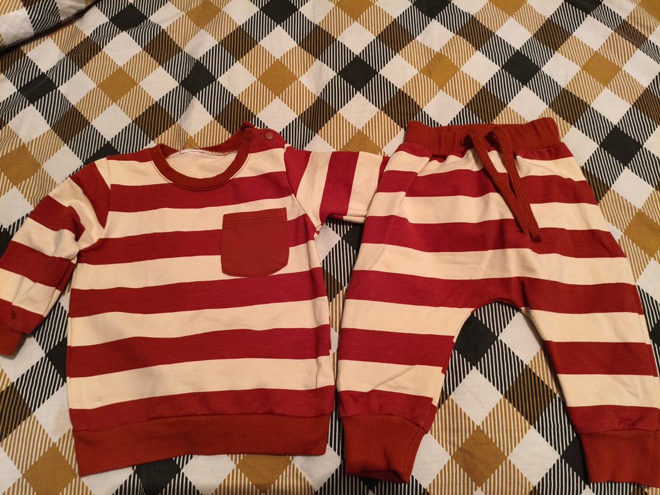 Uzun kollu, yuvarlak yakalı bebek erkek takımı, yumuşak pamuklu ve örme dokuda. Koyu kırmızı ve krem çizgili, küçük göğüs cepli ve lastikli pantolonlu 6-9 aylık .