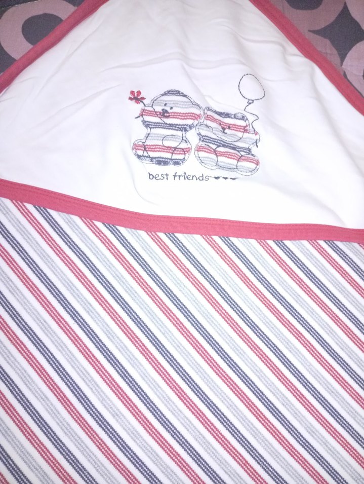 Renkli kırmızı çocuk battaniyesi, yumuşak pamuktan üretilmiş. Üzerinde iki ayı ve "best friends" yazısı bulunan baskılı deseni var. Çizgili ve rahat.