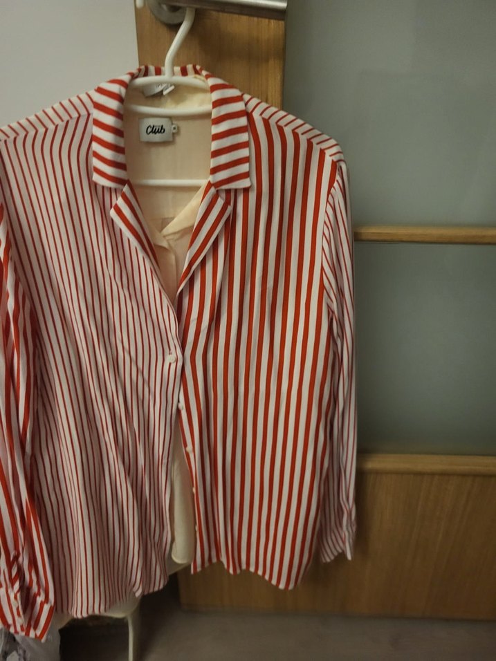 Pamuklu kumaştan, uzun kollu, yakalı ve düğmeli, rahat kesim kadın gömleği. Pastel kırmızı çizgili, günlük kullanıma uygun.