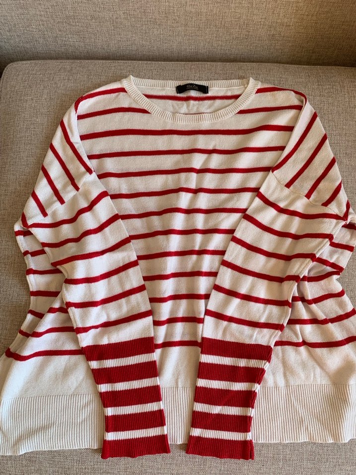 Kadınlar için pamuklu, uzun kollu, yuvarlak yakalı ve bol kesimli örme kazak. Hafif kırmızı çizgili deseniyle rahat sokak stiline uygundur. Markası QuZu