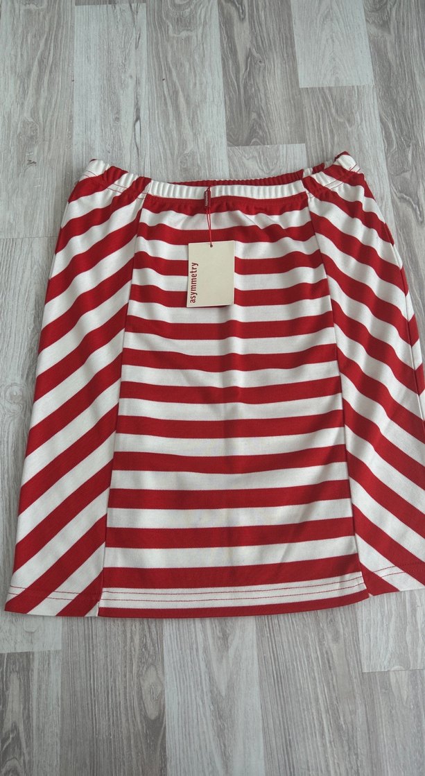 Kırmızı beyaz çizgili, pilili, sentetik kumaştan yapılmış, vücuda oturan midi hamile eteği. Şık dış mekan sokak stili için uygundur.
