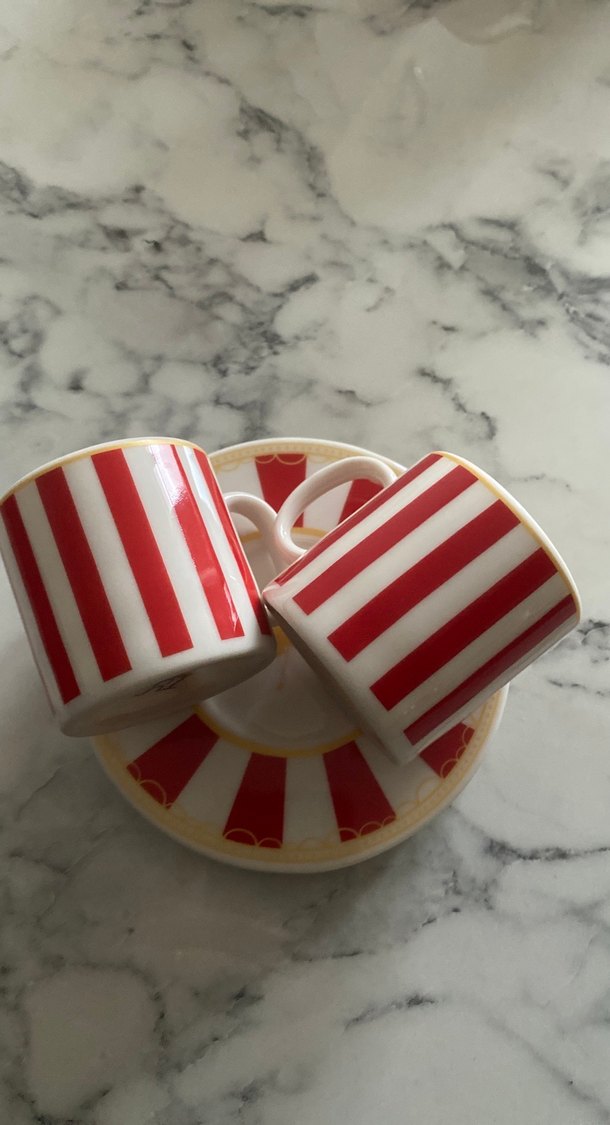 Kırmızı ve beyaz dikey çizgili porselen fincan ve uyumlu altlık seti, sıcak içecekler için uygundur. ☕
