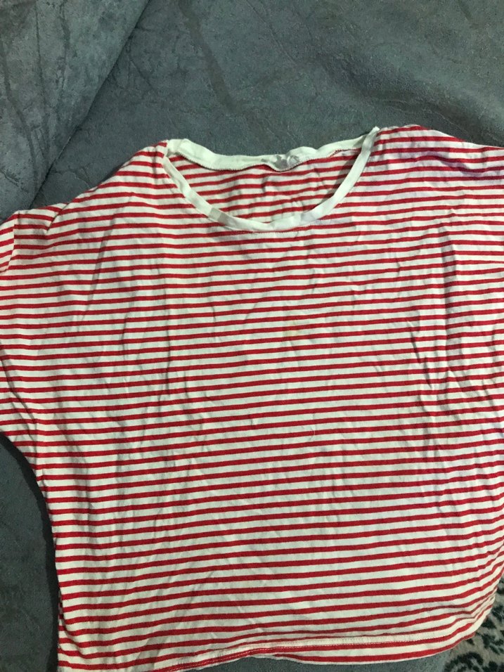 Pamuklu, kısa kollu, kayık yaka, kırmızı beyaz çizgili, bol kesim tişört. Rahat ve günlük kullanım için uygundur.