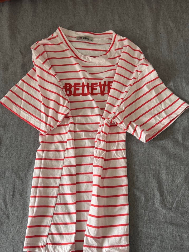 Kırmızı çizgili, kısa kollu, yuvarlak yaka tişört. marka temsili oversizedir