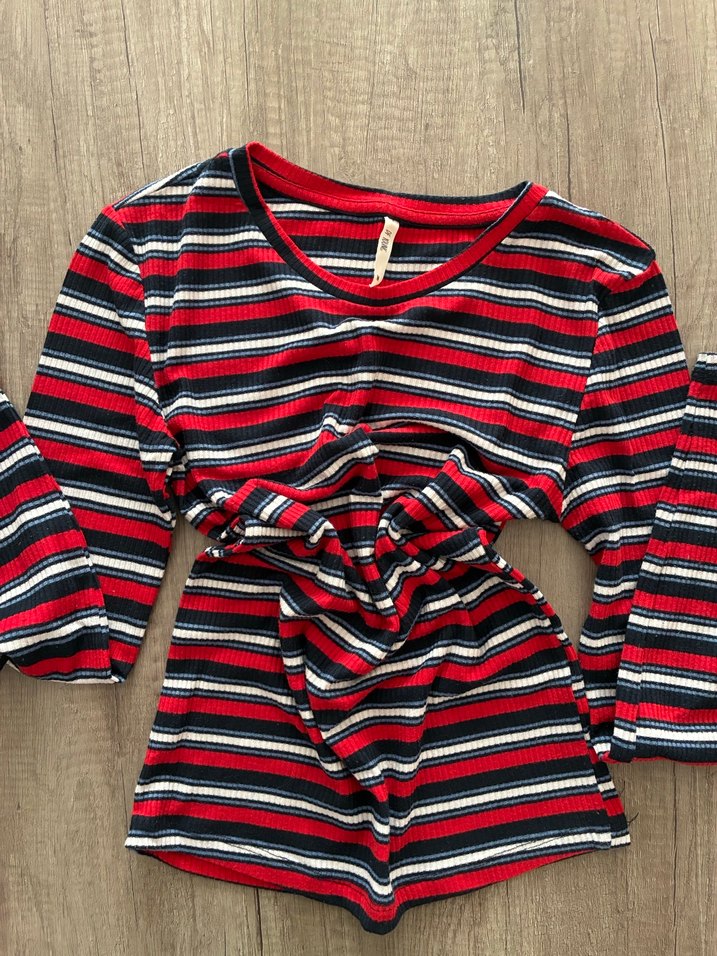 Çizgili, uzun kollu, tekne yaka, kısa boy, triko bluz. Koyu kırmızı renkli, rahat ve bohem tarzda günlük sokak giyimi için uygundur.