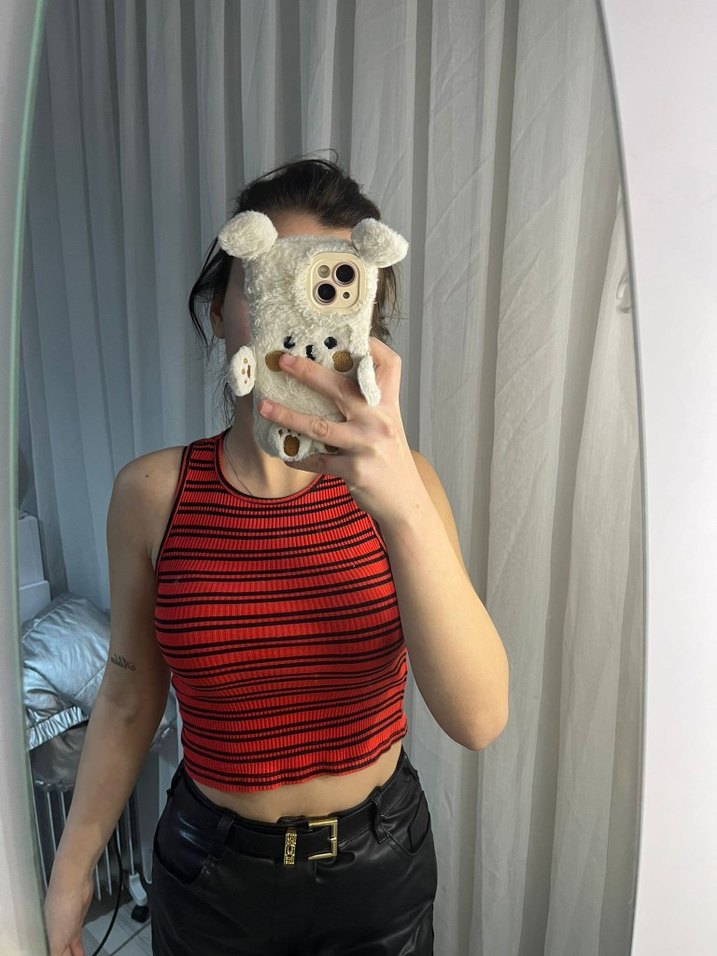 Hafif kırmızı, çizgili triko crop top. Dalgalı etek ucu ve kolsuz tasarımı ile rahat, karşı kültür tarzı sunar.