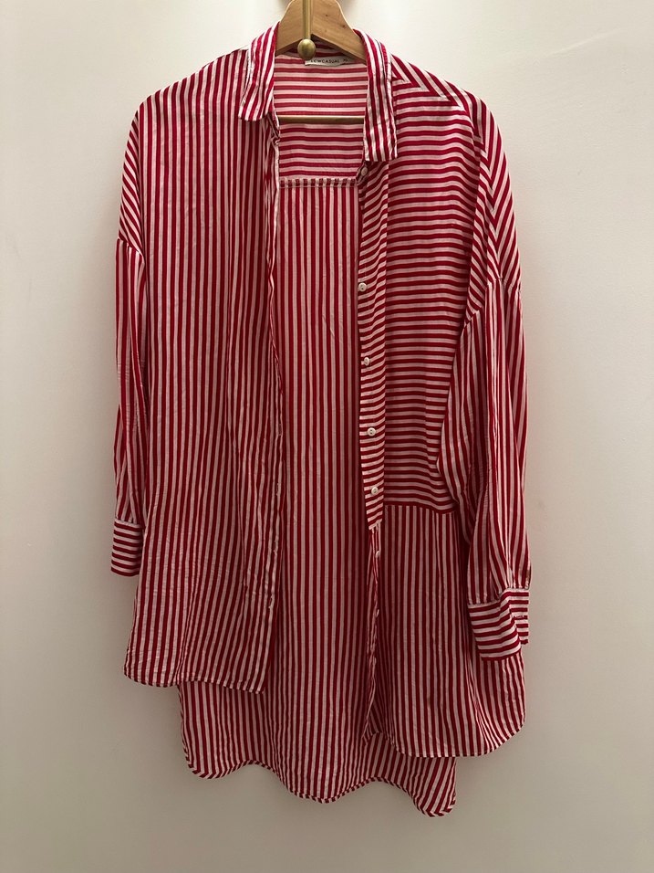 Kırmızı ve beyaz çizgili, pamuk kumaştan yapılmış, bol kesim uzun kollu kadın gömleği.
