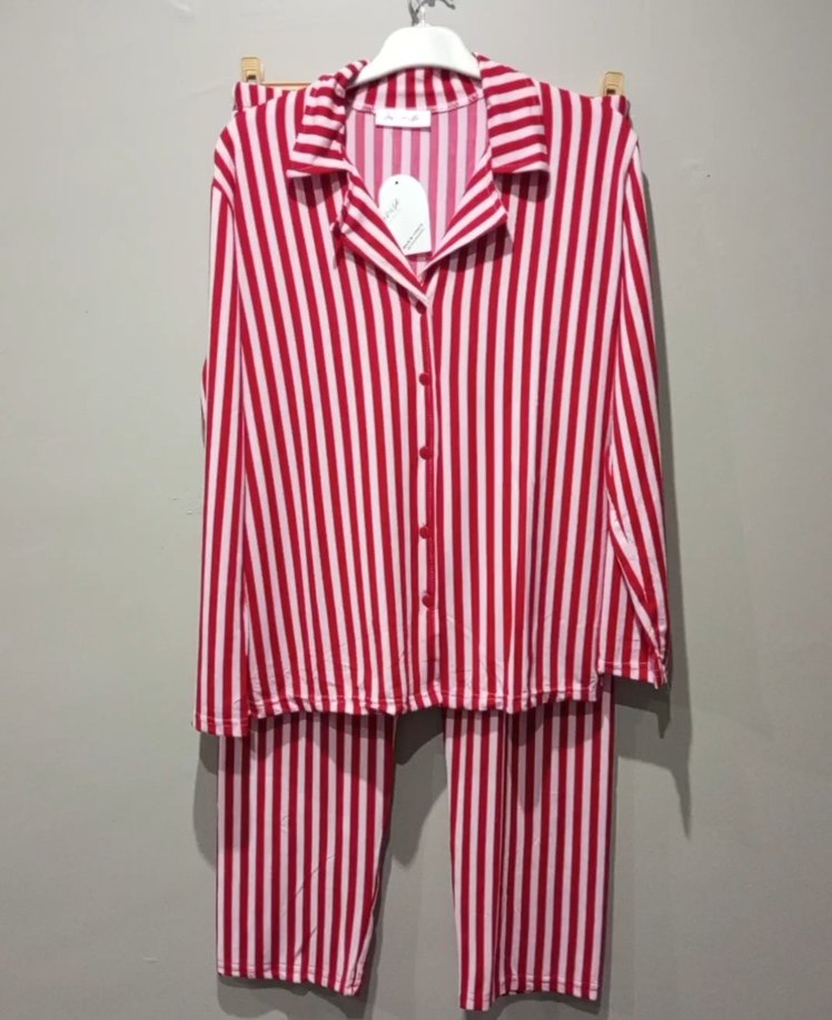 Kadın pijama takımı, uzun kollu. Kırmızı ve beyaz canlı çizgilerle Paris sokak modasından esinlenmiştir. beden için msj lütfen