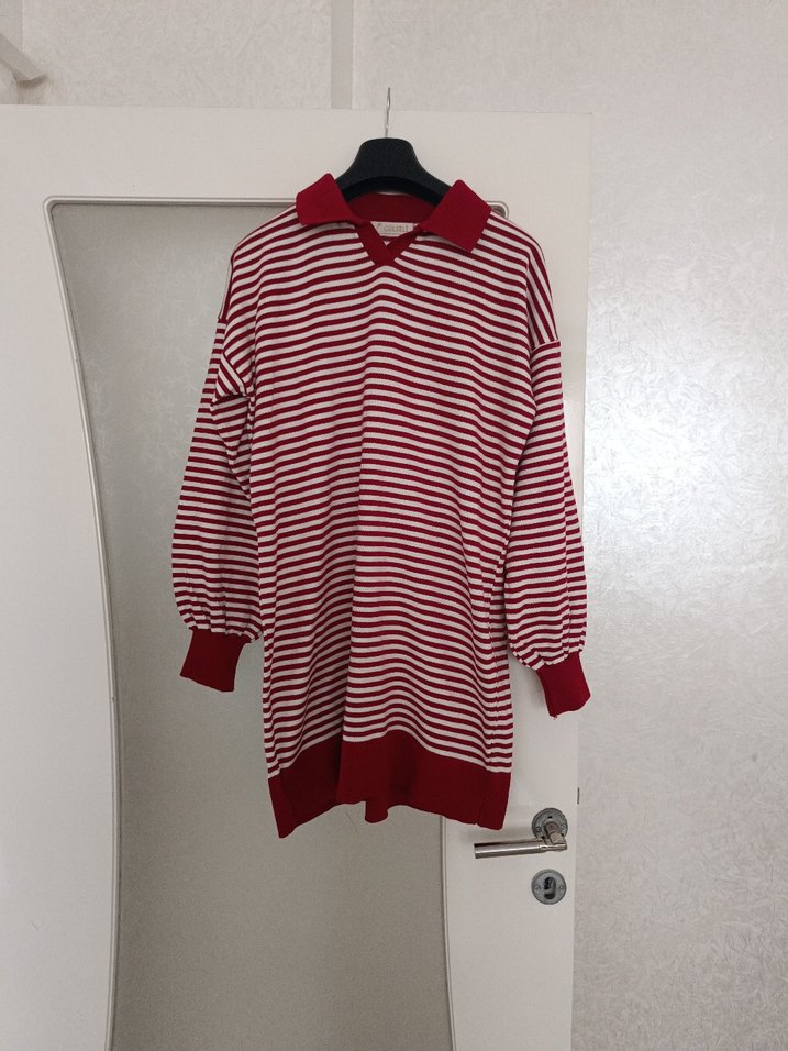 Kırmızı beyaz çizgili, yakalı ve uzun kollu triko kazak, bol kesim ve midi boyda, rahat sokak stili için uygundur.