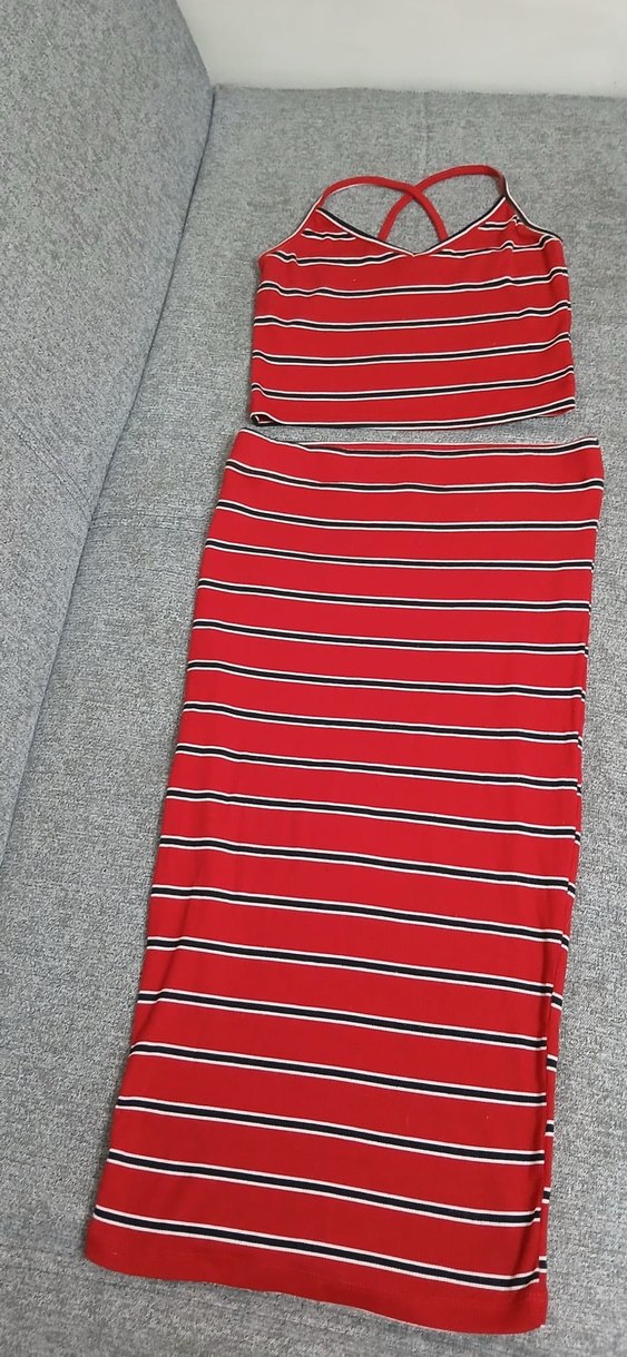 Kırmızı ve gri çizgili, uzun ve vücuda oturan kadın triko elbise. Kayık yaka ve kolsuz tasarıma sahip, yırtmaç detayı bulunur.