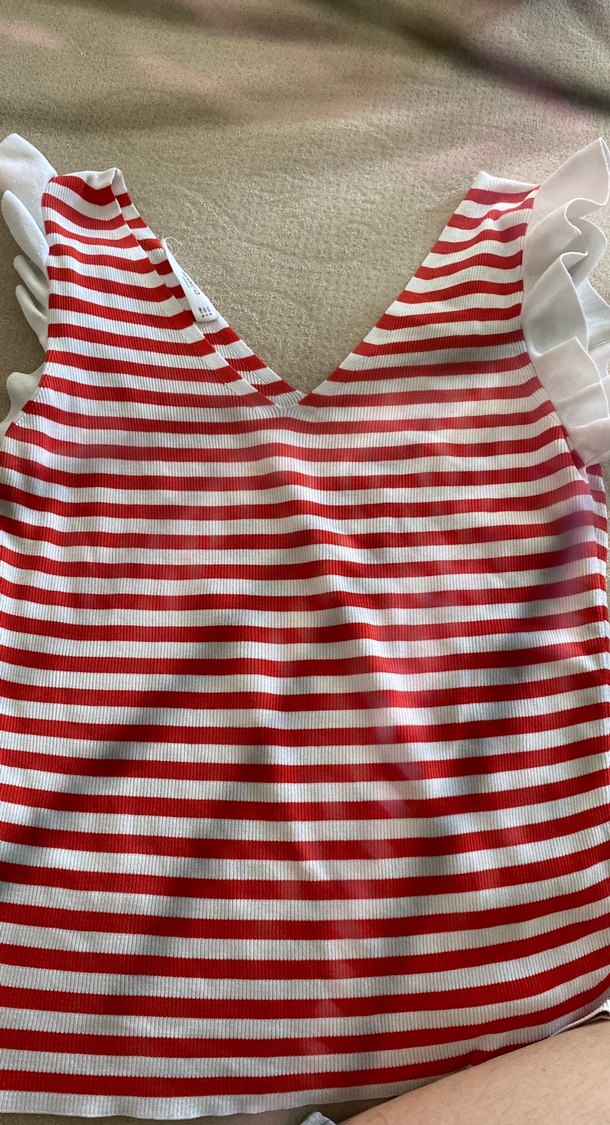 V yaka, kolsuz bluz, kırmızı çizgili ve fırfır detaylı. Günlük sokak tarzına uygun, vücuda oturan midi uzunlukta.