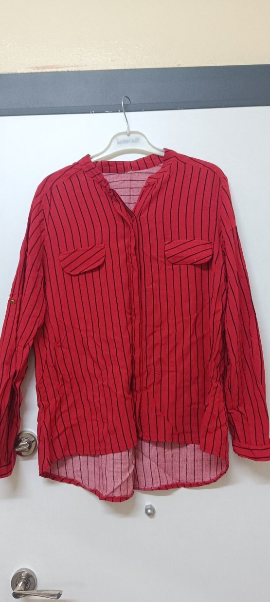 Uzun kollu, düğmeli, kırmızı ve siyah çizgili bol kesim gömlek
