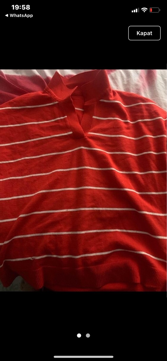 Kırmızı parlak pamuklu kumaştan, beyaz çizgili, V yaka, uzun kollu, bol kesim ve midi boy triko kazak. Günlük rahat sokak stili için uygundur.