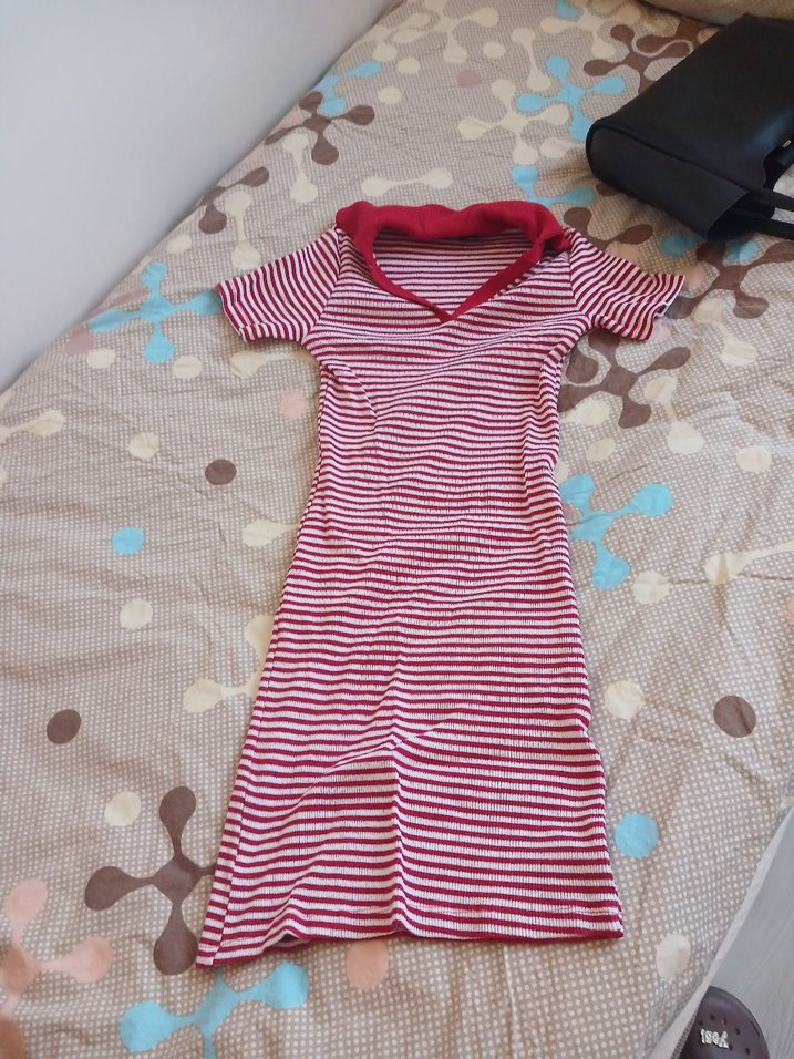 Kırmızı beyaz çizgili, V yakalı ve kısa kollu,dar kesim mini elbise. Günlük rahat, L beden ama fitilli olduğu için s ve m beden giyenlere de olur. 1 kere giydim. Boyum 1.65, diz kapağımın 1 karış üstüne geliyor yürüyünce.