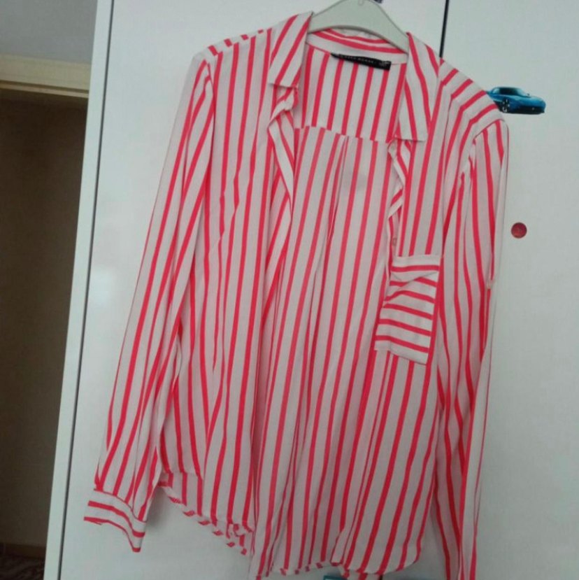nar çiçegi renkli ve beyaz çizgili, V yakalı ve düğmeli, uzun kollu, bol kesim kadın gömleği. Cep üstünde görünen yerde deposu vardır.