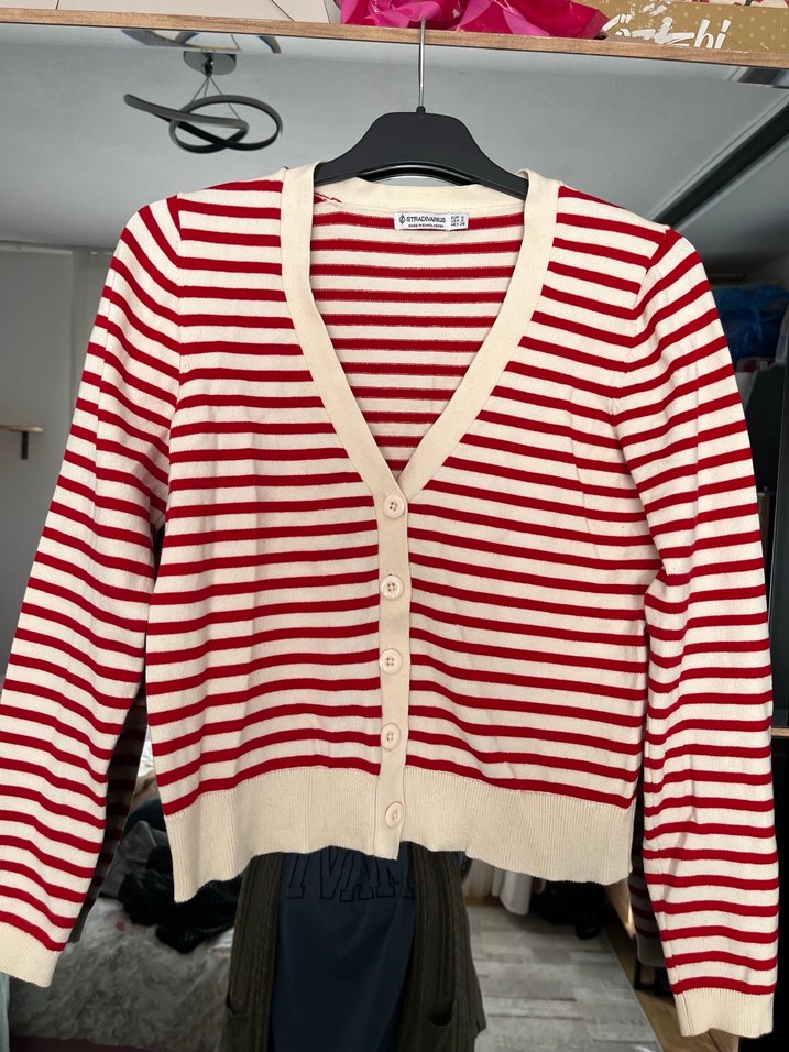 Pamuk kumaştan, kırmızı ve krem çizgili, uzun kollu, V yakalı, düğmeli ve normal midi boyda kadın hırkası. Rahat ve şık bir günlük stil sunar.