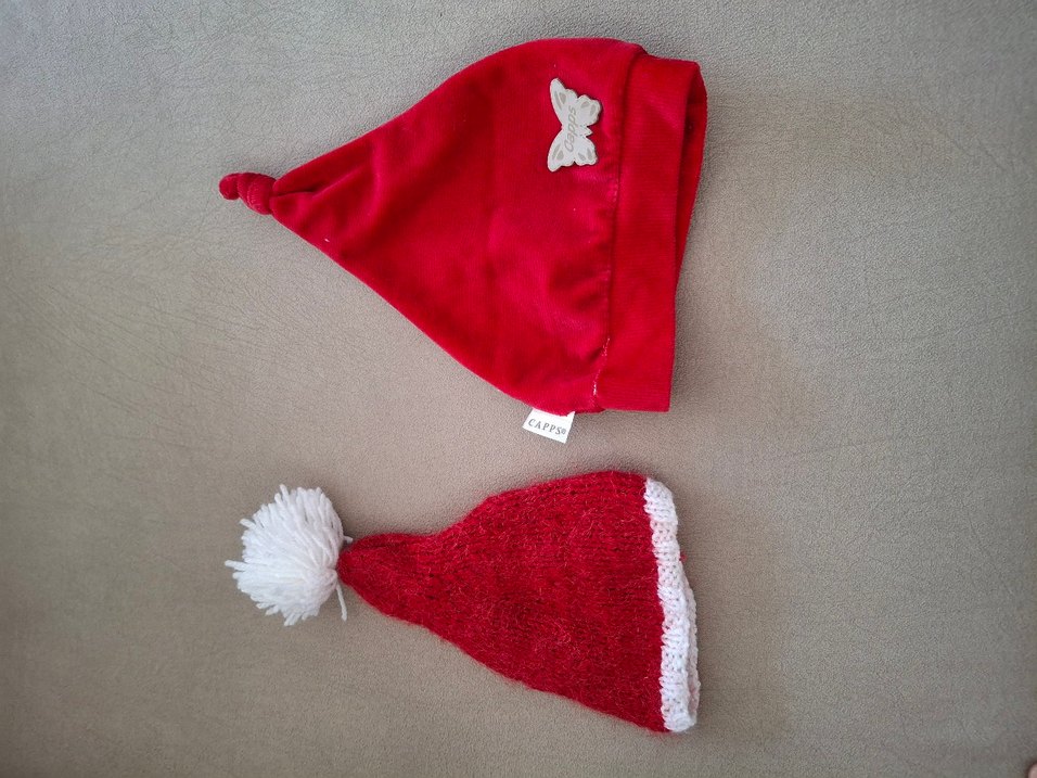 İki kırmızı çocuk şapkası; biri kelebek detayıyla, diğeri beyaz ponpon ve kenarlıklı örgü. Düz ve canlı renklerde.