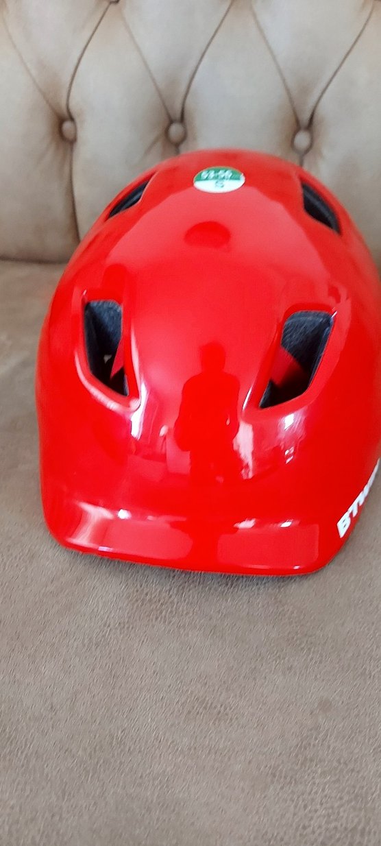 Plastik malzemeden yapılmış kırmızı biker tarzı bisiklet , kaykay , scooter kaskı, Velcro kapamalı ve havalandırma deliklerine sahip. ️ S beden. 53-56 cm