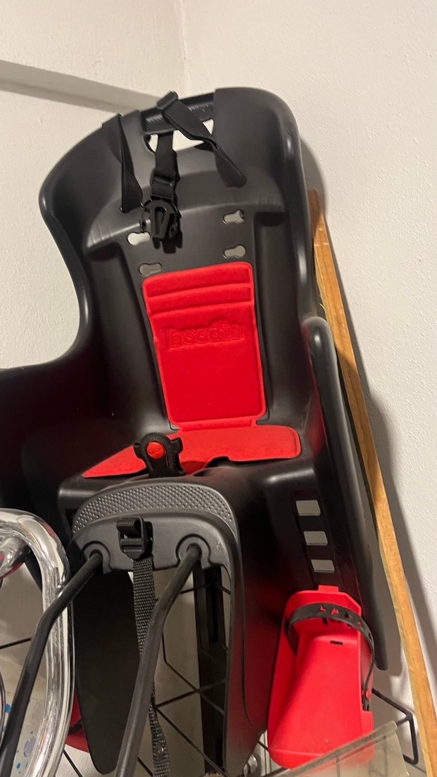 Koyu çerçeveli çocuk bisiklet koltuğunda kırmızı yastıklı sırt desteği ve güvenli emniyet kemerleri bulunur.