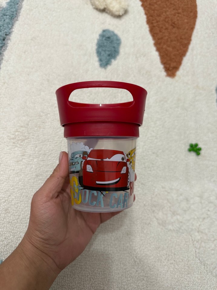 Kırmızı renkli, üzerinde renkli araba desenleri olan ve taşıma kulplu çocuk yiyecek taşıma kabı. Üzerinde "JOCACA" markası bulunur.