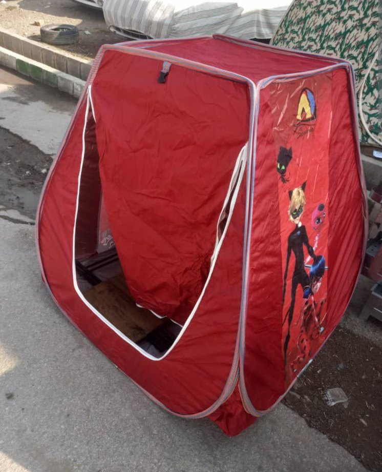 Koyu kırmızı renkli, çizgi film karakterli çocuk dolabı çadırı, oyunlu bir depolama alanı sunar. ️