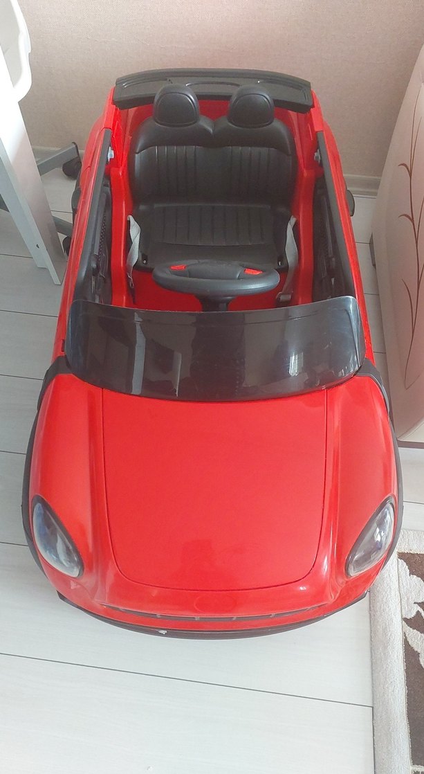 Koyu kırmızı renkte, siyah koltuk ve direksiyona sahip çocuklar için elektrikli akülü araba. Gerçekçi ön cam ve sportif tasarım içerir.sadece aküsü bitmiş cocuk evin icinde 1 kez kullandi durduğu yerde aküsü bitmiş, 12 volt