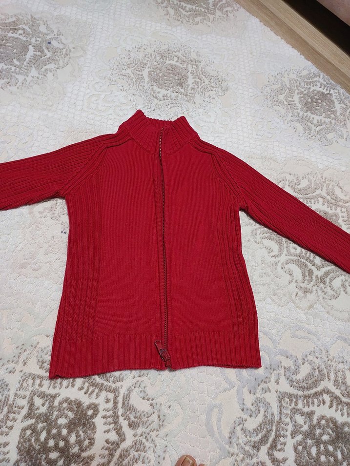 Kırmızı, fermuarlı, yüksek yakalı ve uzun kollu triko kazak. Düz tasarımıyla günlük rahat sokak stili için uygundur.