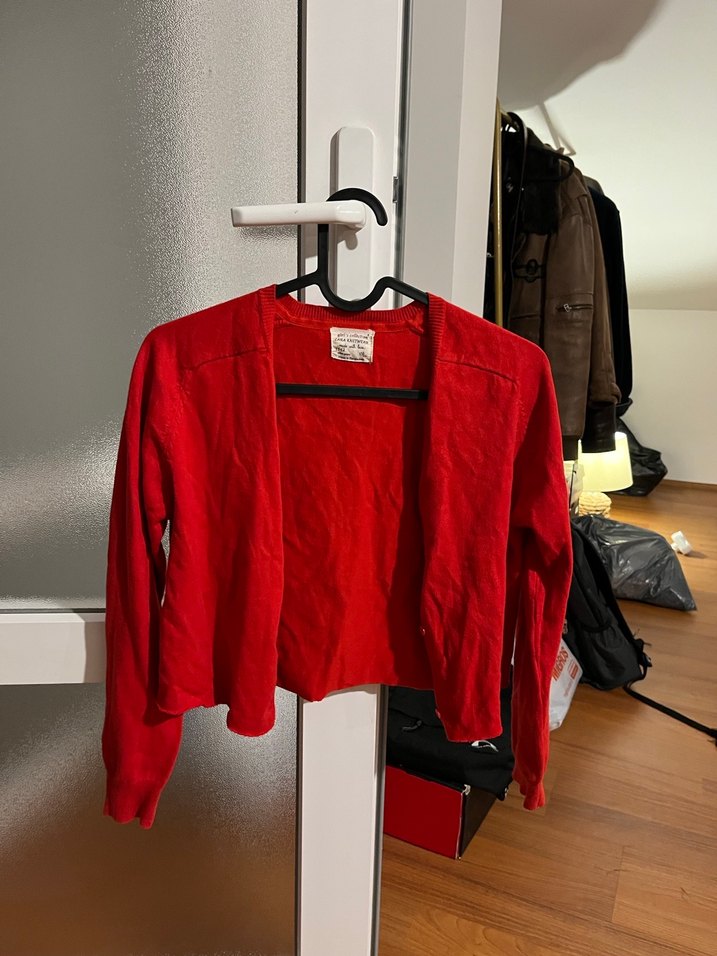 Uzun kollu, bisiklet yaka ve dar kesim kırmızı hırka, yumuşak ve sıcak kumaştan üretilmiştir. Minimalist sokak stiliyle günlük kullanıma uygundur.