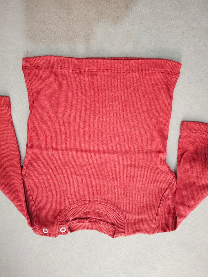 Canlı kırmızı renkte, desensiz çocuk içliği. Yumuşak dokulu, uzun kollu ve omuzda kolay giydirme için çıtçıtlıdır.