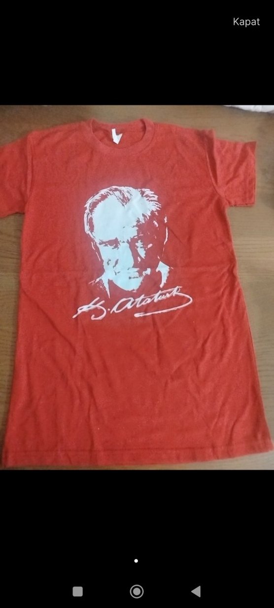 Kırmızı renkte, ön kısmında baskılı portre ve imza bulunan erkek çocuk tişörtü. Yuvarlak yaka, kısa kollu ve bol kesimdir. Pamuklu yumuşak kumaştan üretilmiştir.