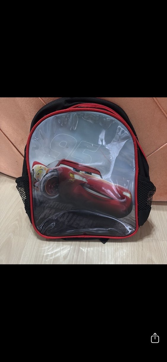 Koyu kırmızı renkte, önünde araba desenli şeffaf cep ve yanlarda file cepler bulunan çocuk okul çantası.