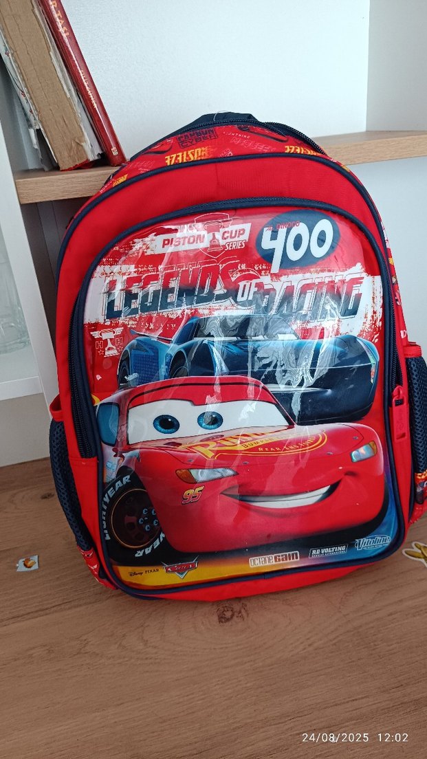 Önde 400 numarası ve yarış arabası desenli renkli kırmızı çocuk okul çantası. ️
