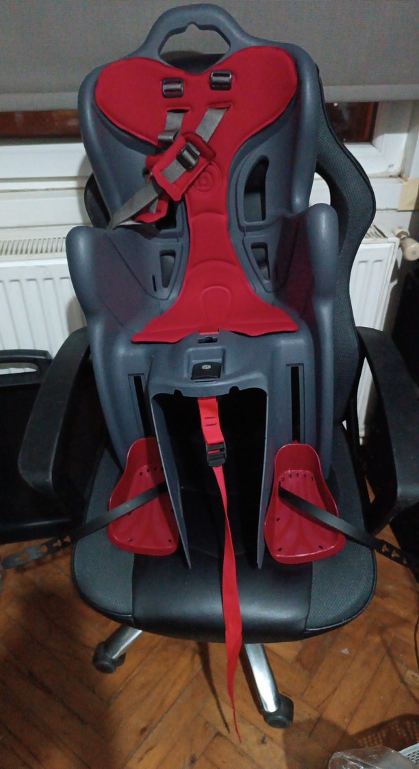 Ayarlanabilir kayışlar ve güvenli tokalarla koyu kırmızı çocuk oto koltuğu. Araba kullanımına uygun rahat tasarım. iki kere kullandık hiçbir yeni bir sorun yok kullanışlı bisikletlere takılıyor