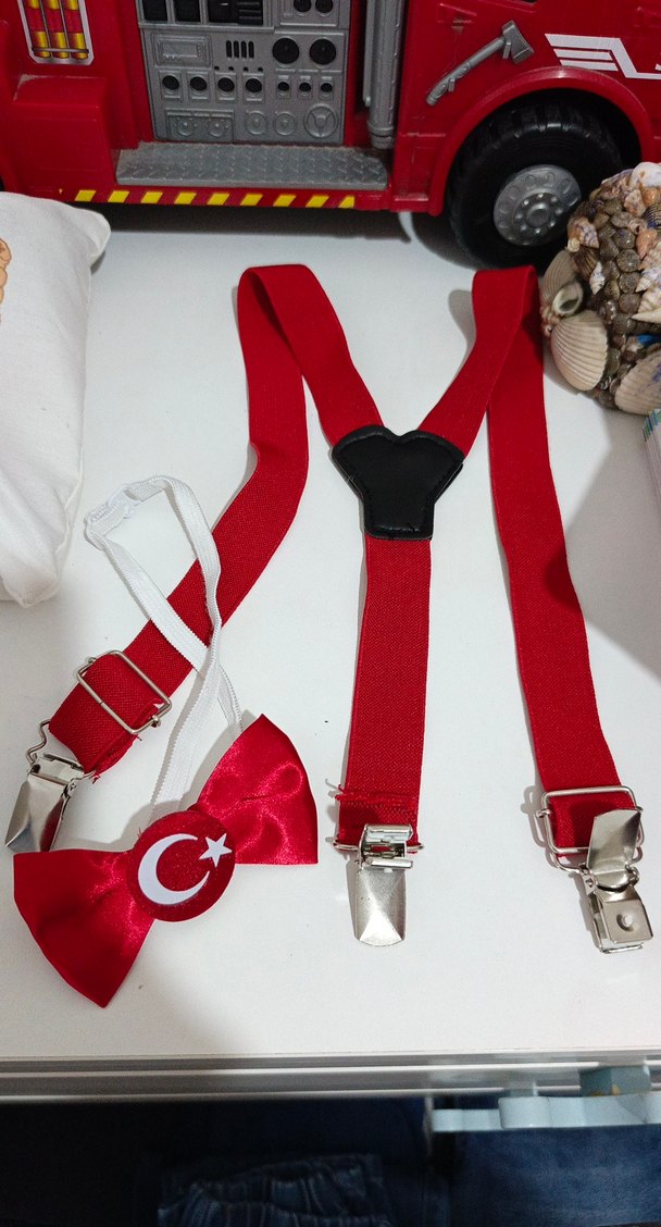 Kırmızı renkli, tokalı çocuk pantolon askısı ve ay-yıldızlı papyon seti. Sentetik kumaştan yapılmıştır.