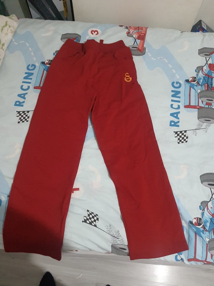 Kırmızı renkte, yumuşak ve rahat kumaştan yapılmış, velcro detaylı ve bol kesim çocuk eşofman altı.
