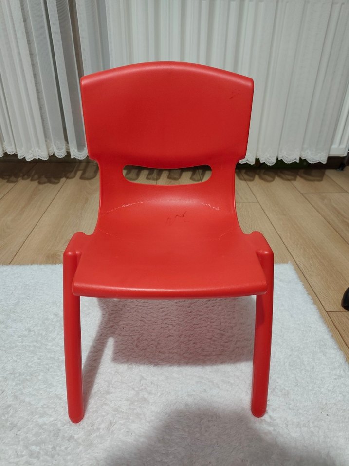 Dayanıklı malzemeden yapılmış, sırt kısmında küçük bir havalandırma boşluğu bulunan kırmızı çocuk sandalyesi.