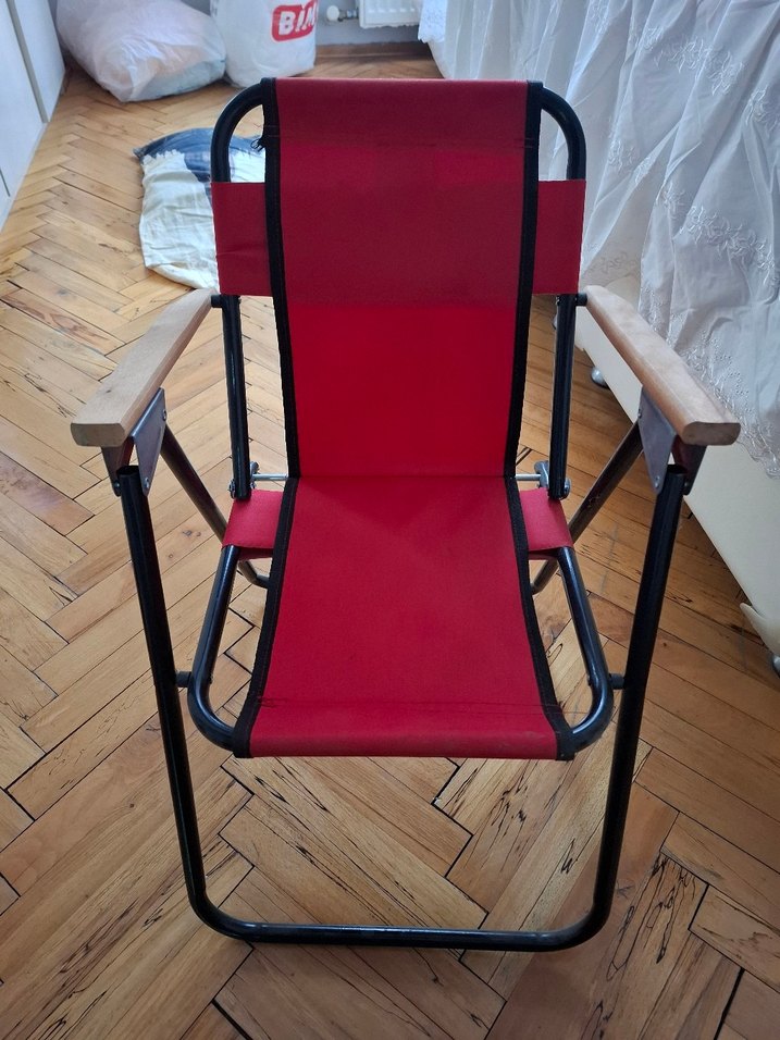 Ahşap kollu, metal iskeletli koyu kırmızı çocuk sandalyesi. Rahat kumaş oturma ve sırt kısmı bulunur. Kumaş üzerinde 'H' harfi yer alır.