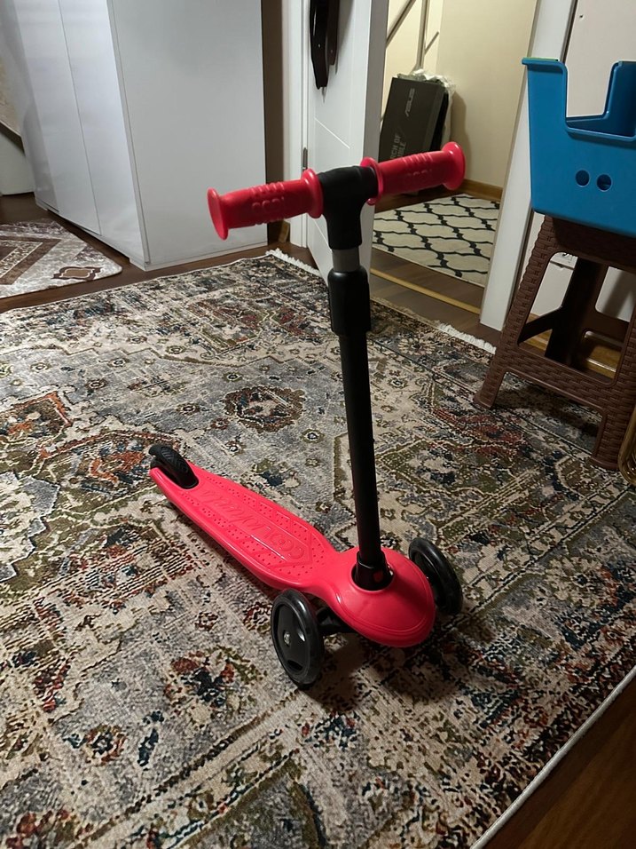 Kırmızı renkte, üç tekerlekli ve dengeli tutuş sağlayan sapı olan çocuk scooter'ı. Renkli tasarımıyla küçük çocuklar için uygundur. Sadece evde kullanilmistir.
